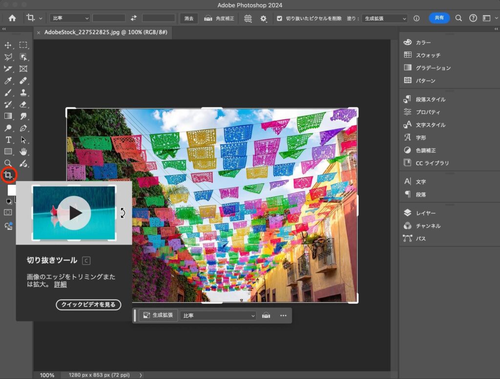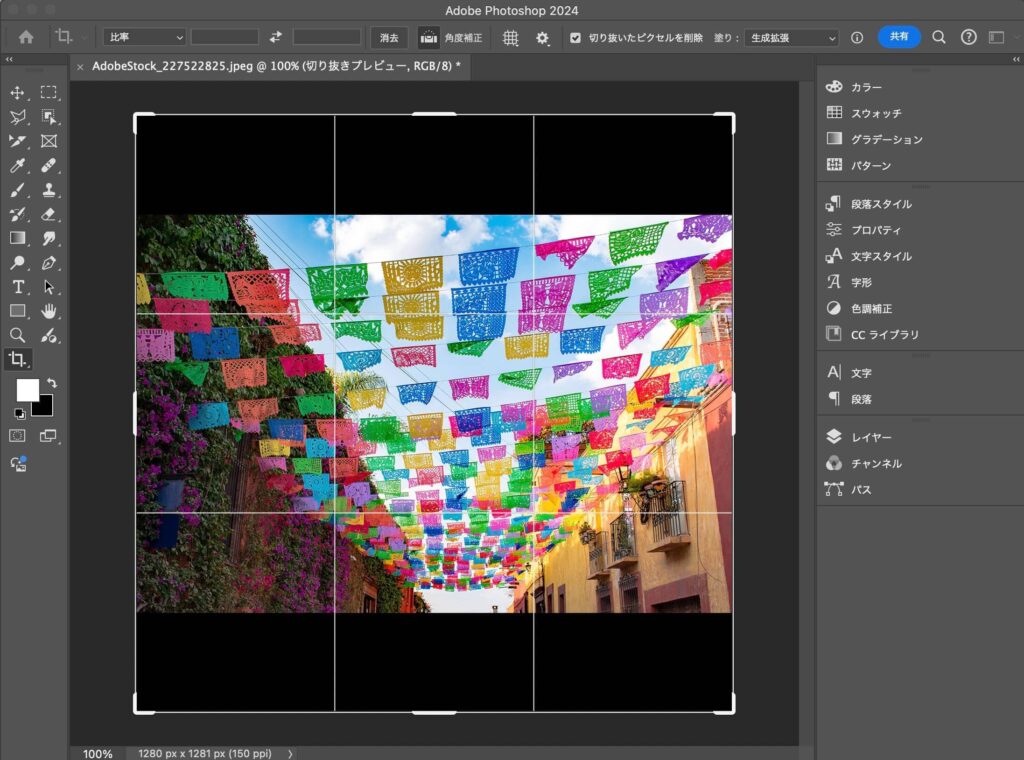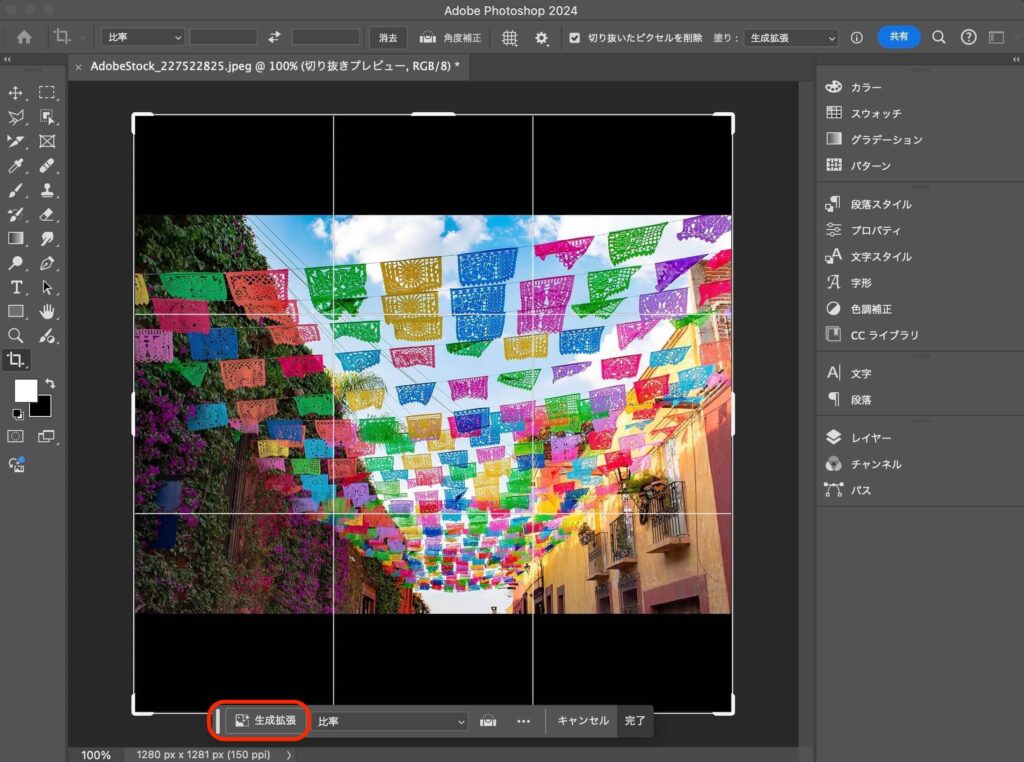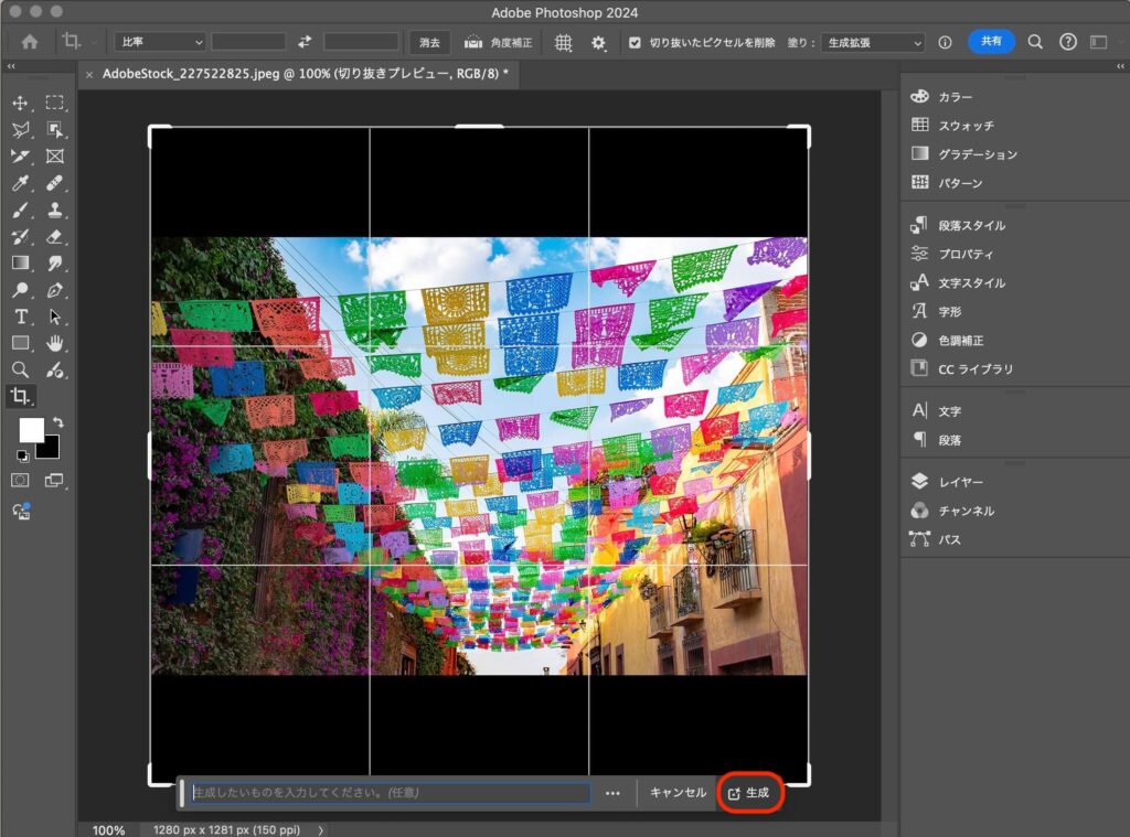 画像の横幅や縦幅を制作する素材にあわせて伸ばしたいけど、元の画像幅が足りずに加工が必要な場合など多くあると思います。Photoshop 2024のAI生成拡張機能を使うと簡単に足りない背景を補完することができます。