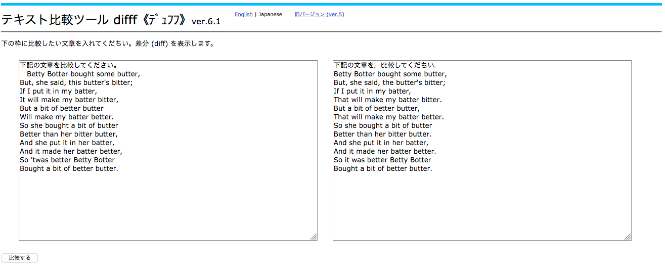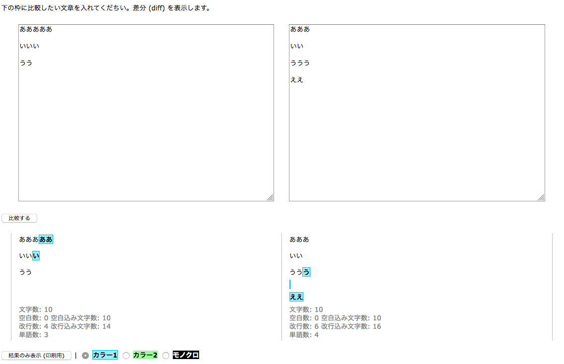 2つのテキストの差分を表示してくれるテキスト比較ツールです。 テキスト比較ツール difff《デュフフ》 https://difff.jp/ 比較したいテキストを左右の入力フォームへコピーして「比較する」ボタンをクリックします。 差分を色付きで表示してくれます。 変更箇所のみ対象テキストと差し替える場合の比較確認ツールとしてとても便利です。