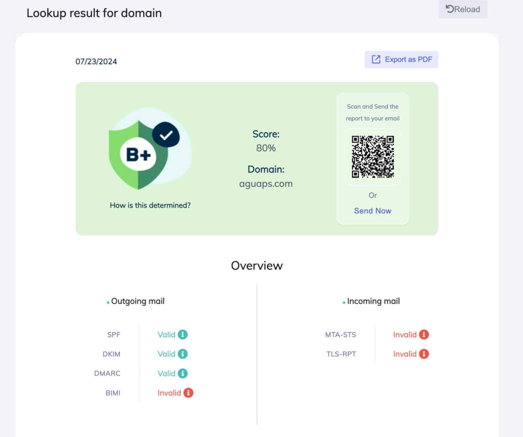 遷移した画面を下にスクロールするとSPF / DKIM / DMARC 各設定のチェック結果が詳しく表示されます。結果画面はPDFにエクスポートできるので共有するのにも便利です。