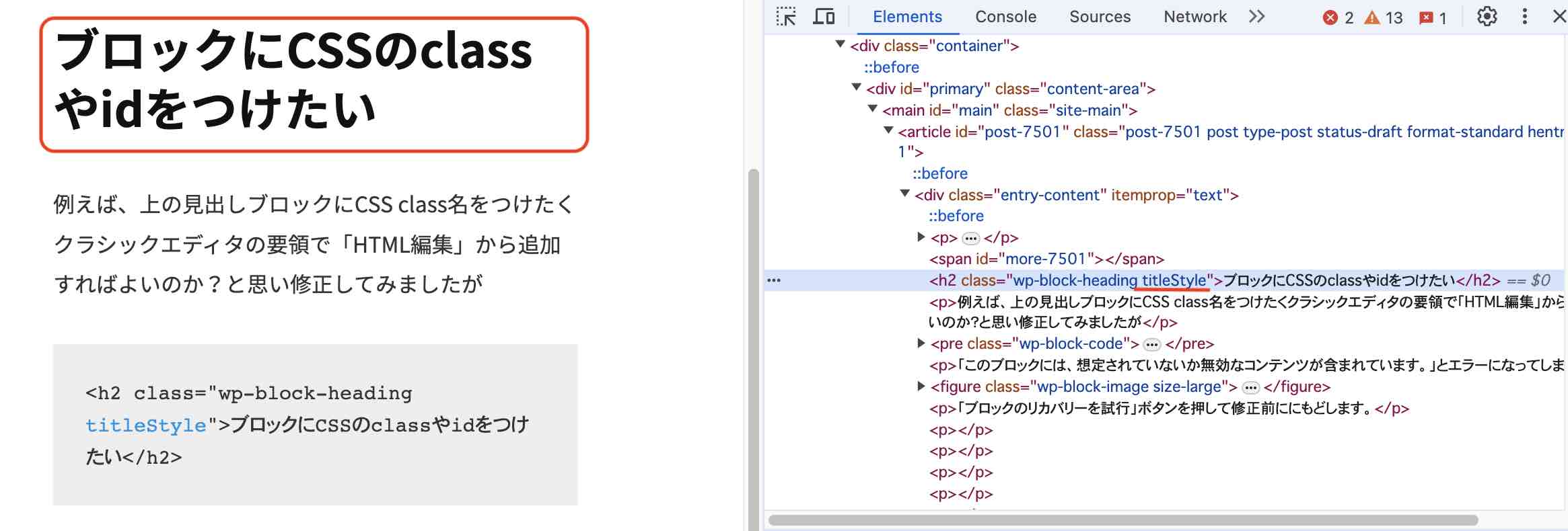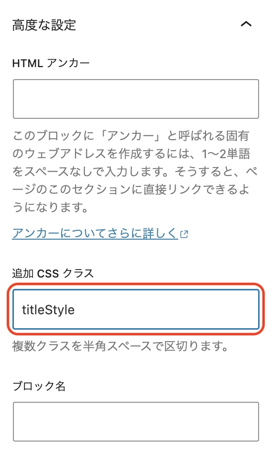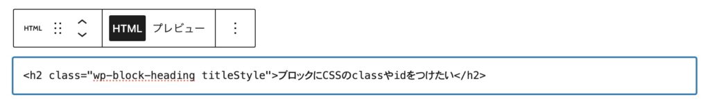 <h2 class="wp-block-heading titleStyle">ブロックにCSSのclassやidをつけたい</h2>