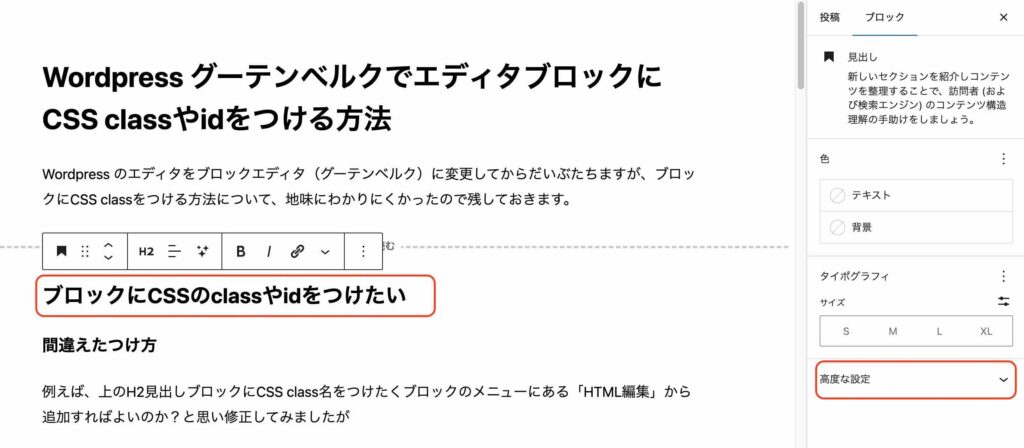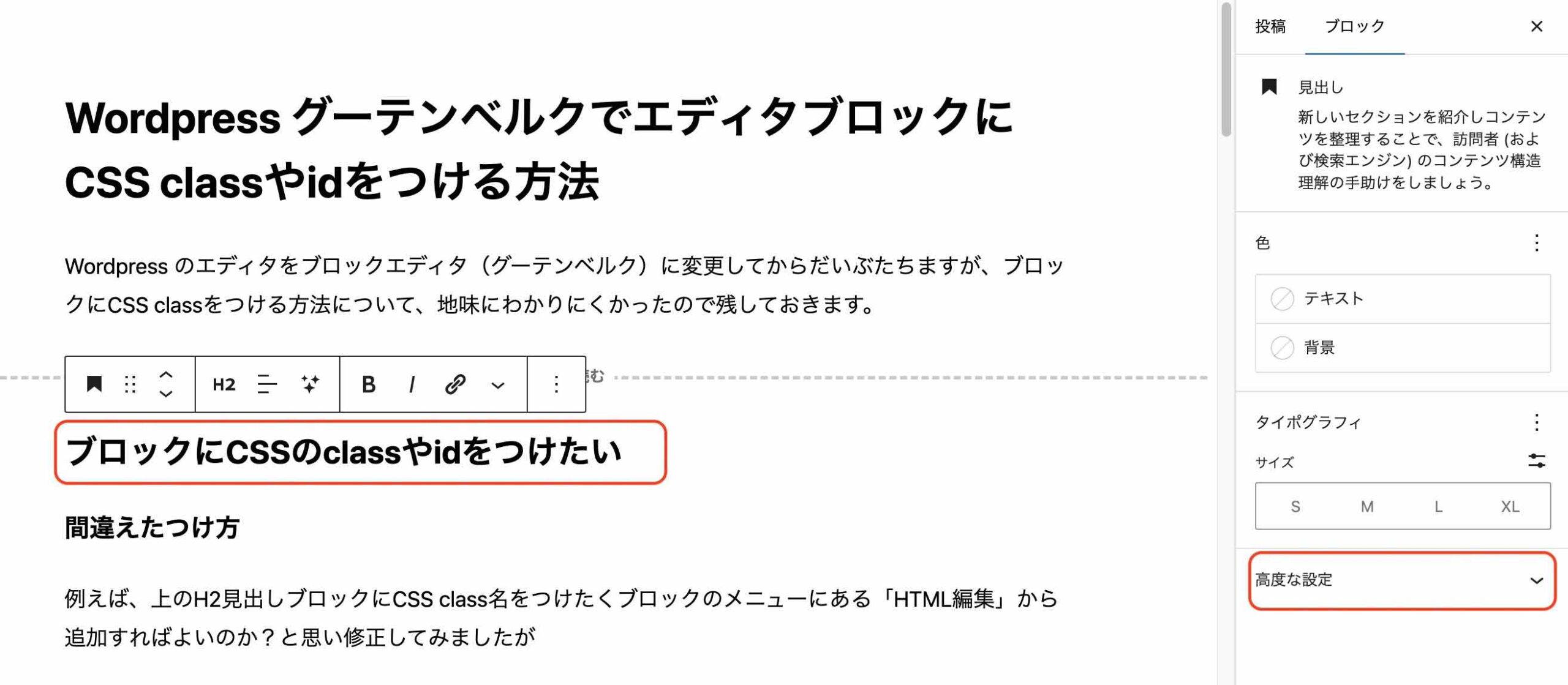 WordPress のエディタをブロックエディタ(グーテンベルク)に変更してからだいぶたちますが、ブロックにCSS classをつける方法について、地味にわかりにくかったので残しておきます。