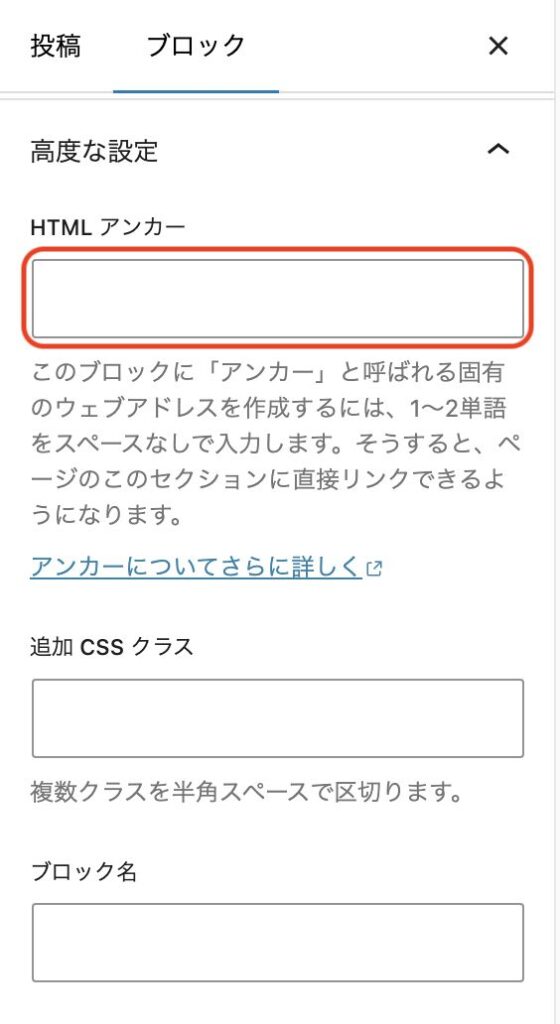同様にidを付与するブロックを選択して右側のブロック設定メニューの中にある「高度な設定」の「HTML アンカー」の欄に入力するとidが追加されます。ページ内リンクを目的とした使い方が多いかもしれません。