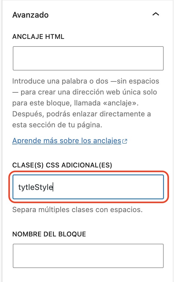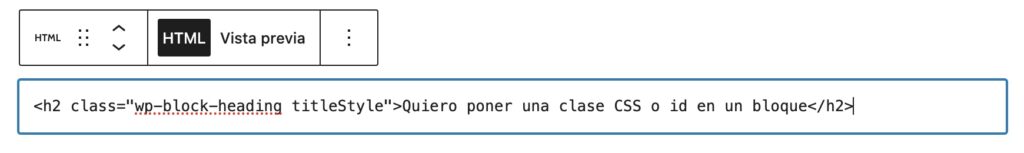 <h2 class="wp-block-heading titleStyle">Quiero poner una clase CSS o id en un bloque</h2>
