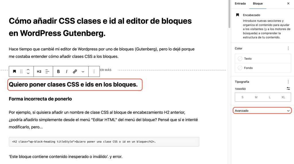 Por ejemplo, si quisiera añadir un nombre de clase CSS al bloque de encabezamiento H2 anterior, ¿podría añadirlo simplemente desde el menú «Editar HTML» del menú del bloque? Pensé que sí e intenté modificarlo, pero…