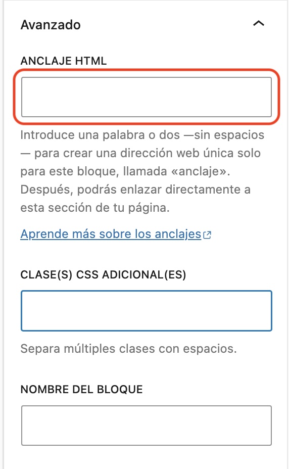 Del mismo modo, seleccione el bloque al que desea añadir el identificador e introdúzcalo en el campo «Anclaje HTML», en «Avanzado», en el menú de configuración de bloques situado a la derecha. Puede utilizarse para establecer enlaces dentro de la página.